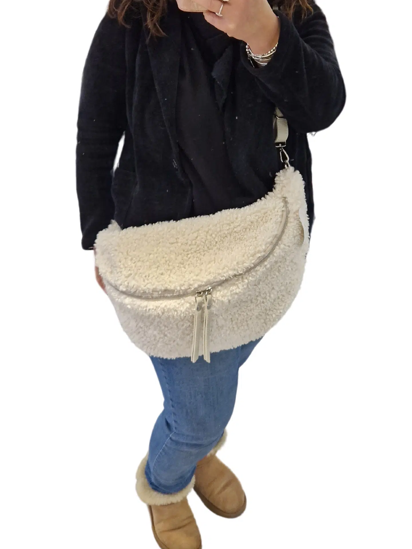 Très grand sac banane en moumoute – Anse en cuir, grande capacité, idéal pour mamans et sport